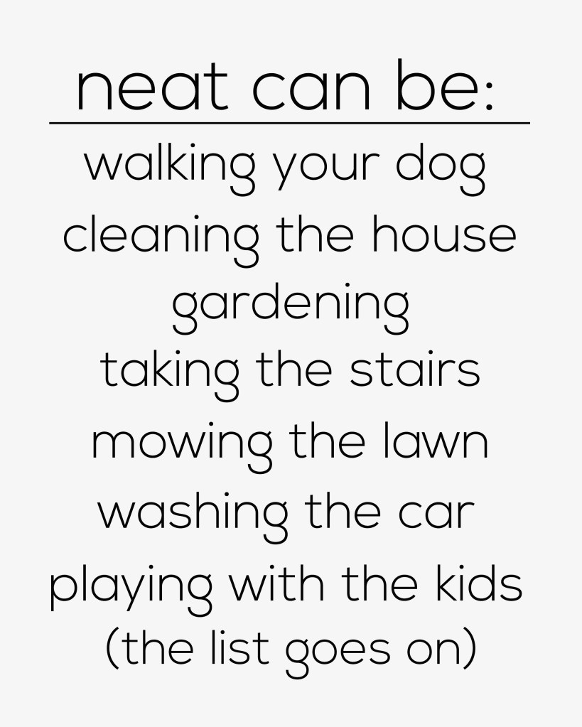 Cleaning the house (this is NEAT at its finest). You can amplify the calorie burn by turning on the music and dancing while you tidy up the space!