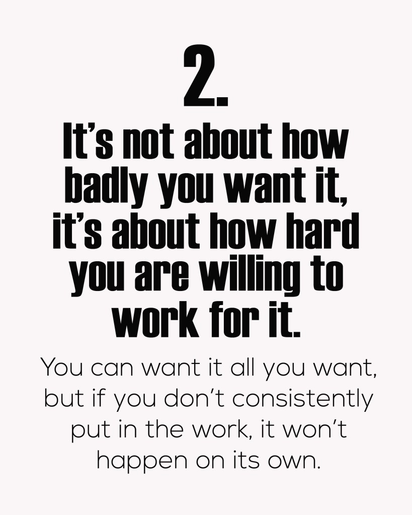 2. It’s not about how badly you want it. It’s about how hard you’re willing to work for it. You can want it all you want, but if you don’t consistently put in the work, it won’t happen on its own. Wishing, wanting, and waiting doesn’t do anything. You must act and you must be willing to do what is needed to attain the results you desire. You don’t have to be 100% perfect every day, but you need to be 80% consistent over time. Start slowly with small realistic goals and increase them overtime. It isn’t easy, but it is worth it.