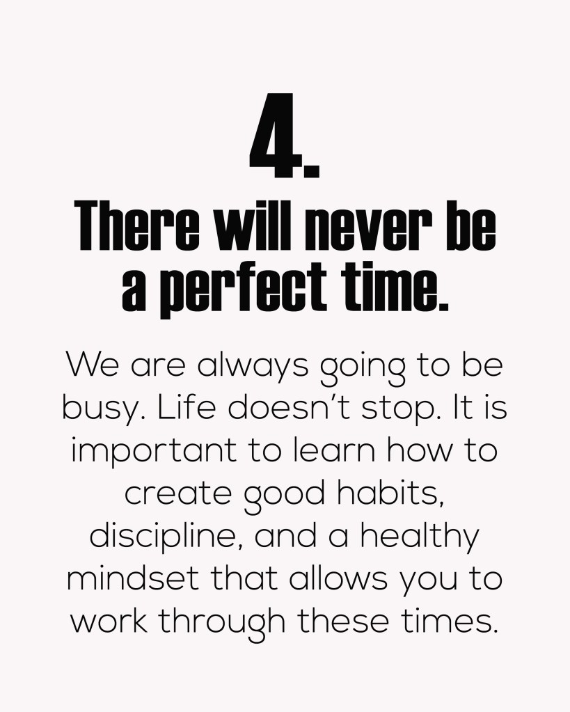 4. There will never be a perfect time. We are always going to be busy and there will always be holidays and vacations throughout the year. Life doesn’t stop. It is important to learn how to create good habits, discipline, and a healthy mindset that allows you to work through these times. It is about making the time and your health a priority in your life. If you learn how to live a healthy and sustainable lifestyle during the busiest of times, the rest of the year will be a piece of cake!