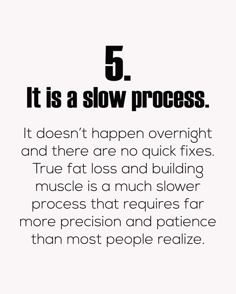 5. It is a slow process. It doesn’t happen overnight and there are no quick fixes. If you are losing weight quickly, chances are that it won’t stay off long-term. True fat loss and building muscle is a much slower process that requires far more precision and patience. I know many people would like to reach their goals in 1 or two months, however it may take months to see real signs of progress. For many, it will take years to ultimately reach their final goal. Don’t get frustrated, just know that slow and steady wins the race!