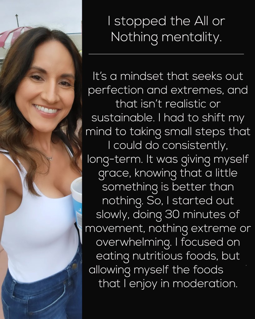 For several years I had the mindset that if I couldn’t do it all, I might as well do nothing. I thought if I couldn’t workout 5 days a week and I couldn’t maintain a strict “diet”, then why even try?! That mindset seeks out perfection and extremes, which aren’t realistic or sustainable.
