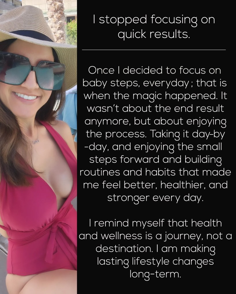 Wanting to reach that goal as quickly as possible is a mindset that doesn’t help us in the long run. It is a surefire way to feel frustrated and defeated when you don’t see result happening quickly enough. Making changes to our health takes time and there is no end.