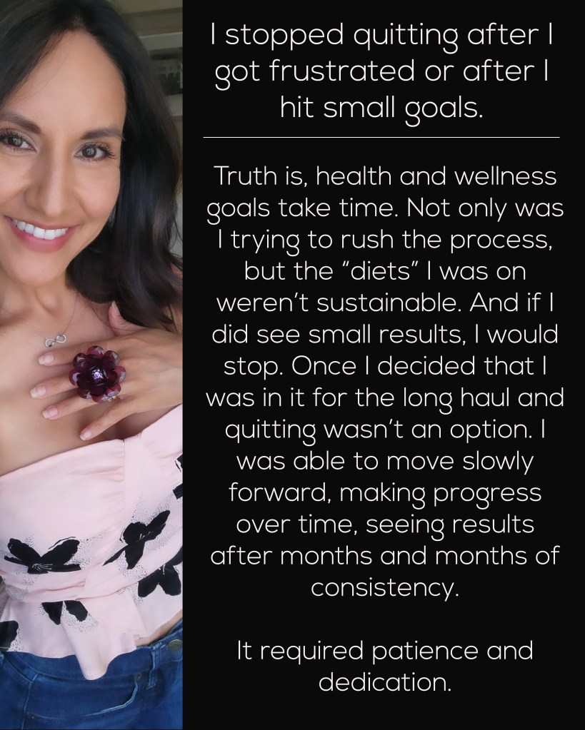 I frequently quit after I got frustrated when I didn’t see results, but I wasn’t patient, and health and wellness goals take time. There’s no finish line. It goes on forever.