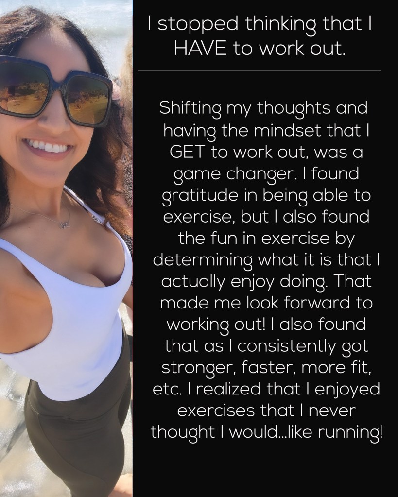 Working out can definitely feel like a drag when you have the mindset that you HAVE to work out. I remember it feeling like a chore and that I felt like I always needed to get it over with. Shifting my thoughts and having the mindset that I GET to work out, was a game changer.